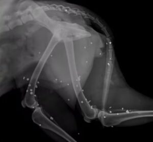 Exames de raio-x revelaram que o animal foi atingido por 43 chumbinhos, tipo de munição utilizada em espingardas, espalhados pelo corpo e próximos a órgãos vitais.