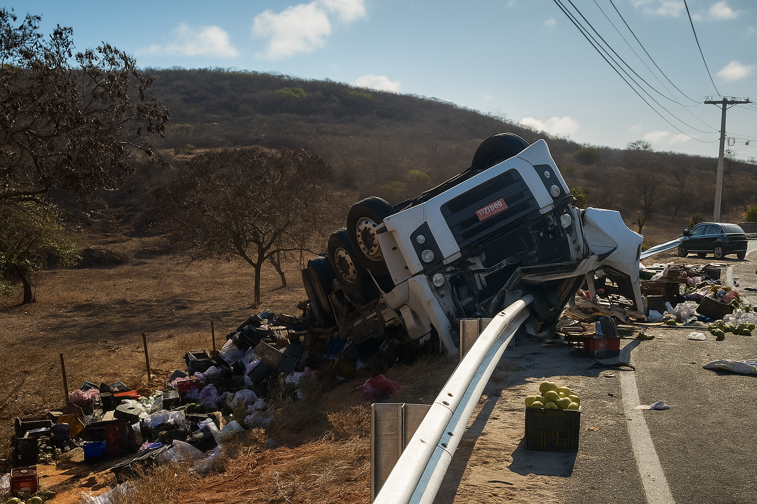 O caminhão, com placa de São Paulo, transportava uma carga de frutas no momento do ocorrido.
