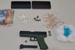 Durante a ação, os policiais abordaram dois suspeitos, sendo um deles menor de idade. Com a dupla, foram apreendidos um simulacro de pistola, porções de maconha, crack e cocaína, além de dinheiro e um telefone celular.