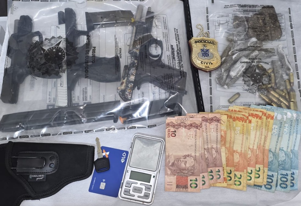 O investigado foi autuado em flagrante por tráfico de drogas e posse ilegal de arma de fogo de uso restrito.