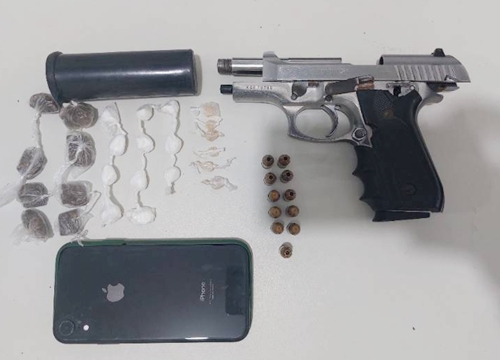 A equipe policial apresentou na delegacia uma pistola calibre 380, munições, celular maconha, cocaína e crack (foto acima).